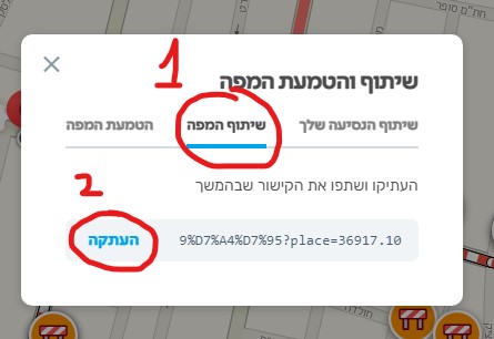 במסך שיקפוץ לכם, בוחרים ב"שיתוף המפה", ולאחר מכן מעתיקים את הקישור ע"י לחיצה על "העתקה".